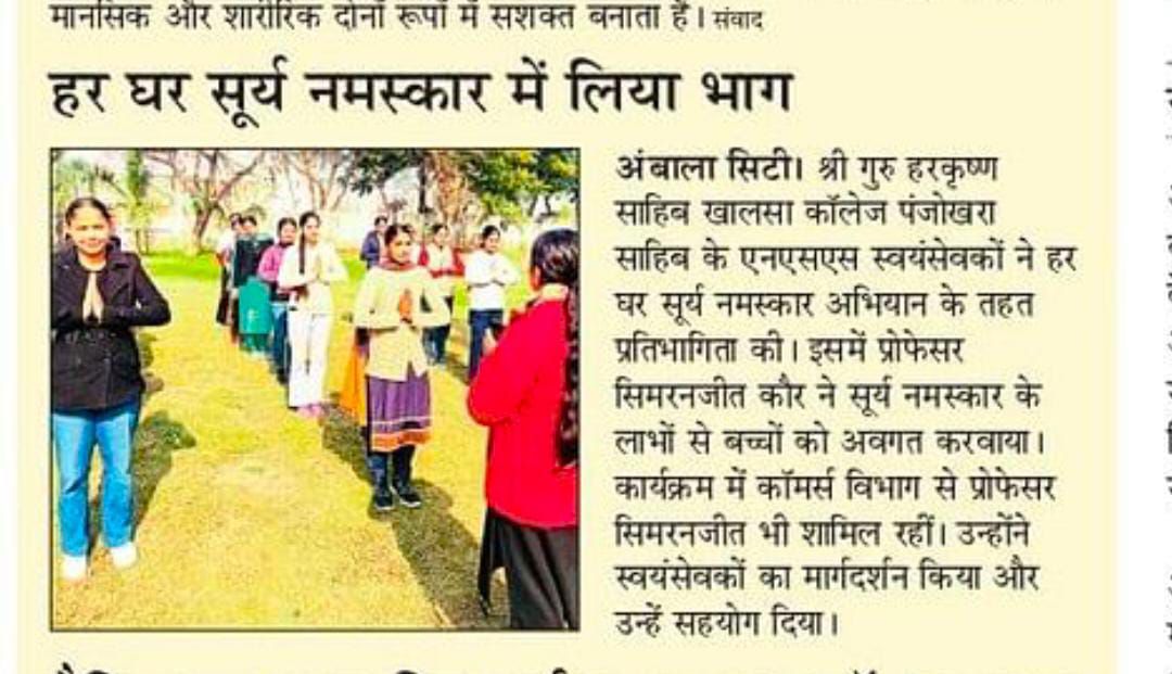 हर घर सूर्य नमस्कार योजना के अंतरगत श्री गुरु हरि कृष्ण साहिब खालसा कॉलेज के विद्यार्थी व एन एस एस स्वयंसेवकों ने इस योजना में भाग लिया । प्रोफेसर सिमरनजीत कौर ने सूर्य नमस्कार के फायदे से बच्चों को अवगत कराया और योजना में पंजीकरण भी करवाया। April 26, 2026April 26, 2026 Harminder