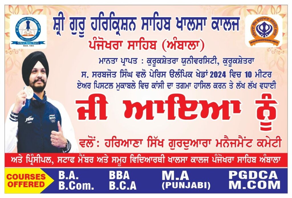Bronze medalist in Olympic 2024 in shooting Sarabjot Singh visited in college along with HSGMC President Jathedar Bhupinder Singh Assandh and other members of Haryana Sikh Gurdwara Management Committee. Principal Dr. Sukhdev Singh and staff members honoured Sarabjot Singh for great achievement in Olympic 2024. Sarabjot Singh shared his journey and motivated students to focus toward Aim of life.