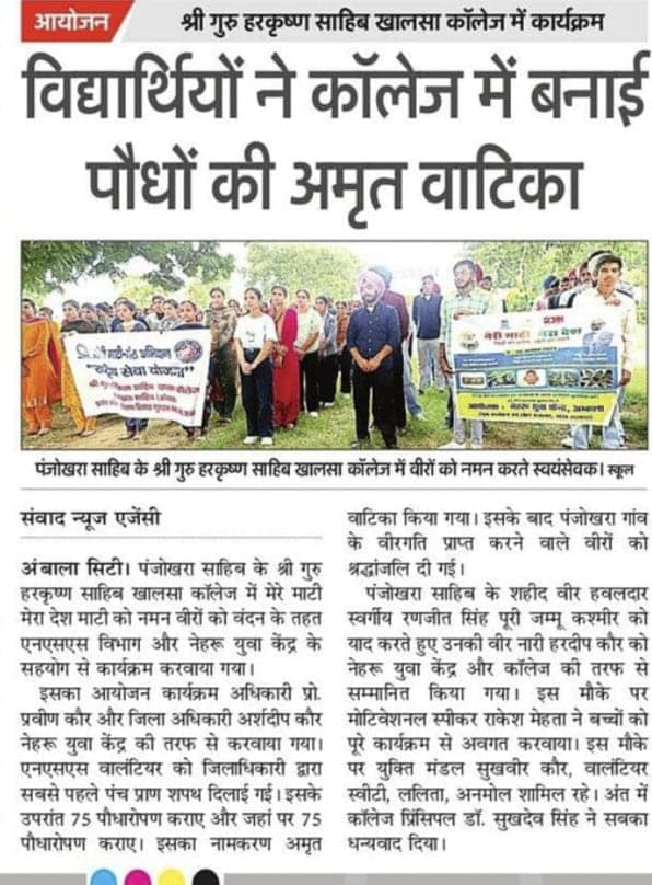 A Camp Was Organized in the College by NYKC and NSS Department Under the theme of” Meri Mati Mera Abhiyan” Dr. Rakesh Mehta,(Motivational Speaker) District officer Arshdeep Kaur, NYKS College Principal, Staff members Were all Present and Virnari Hardeep Kaur of Freedom Fighter Late Swaranjeet Singh was honored.