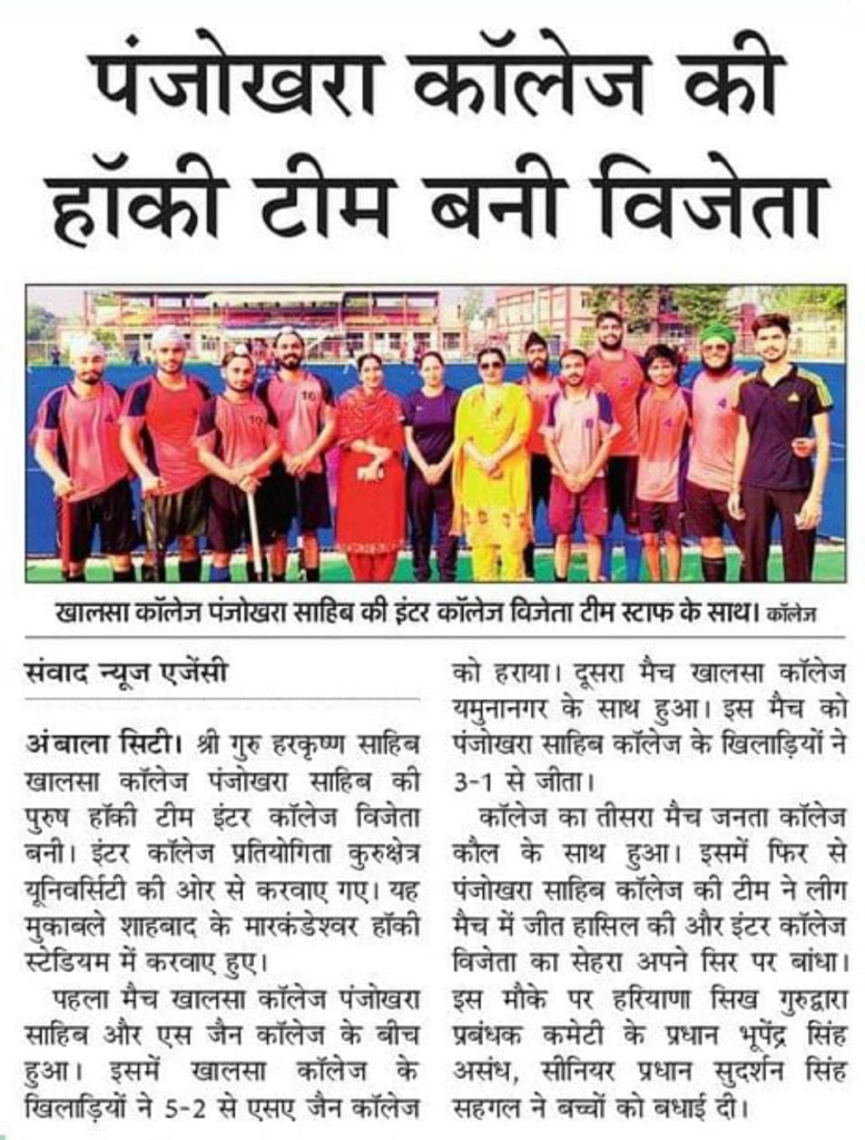 • ਸ਼੍ਰੀ ਗੁਰੂ ਹਰਕ੍ਰਿਸ਼ਨ ਸਾਹਿਬ ਖਾਲਸਾ ਕਾਲਜ ਪ੍ਰਬੰਧ ਅਧੀਨ ਹਰਿਆਣਾ ਸਿੱਖ ਗੁਰਦੁਆਰਾ ਮੈਨੇਜਮੈਂਟ ਕਮੇਟੀ ਪੰਜੋਖੜਾ ਸਾਹਿਬ ਵੱਲੋਂ ਸਾਹਿਬਜ਼ਾਦਿਆਂ ਦੀ ਸ਼ਹਾਦਤ ਨੂੰ ਸਮਰਪਿਤ ਧਾਰਮਿਕ ਸਮਾਗਮ ਕਰਵਾਇਆ ਗਿਆ ਜਿਸ ਵਿੱਚ ਸਮੂਹ ਸਟਾਫ ਤੇ ਵਿਦਿਆਰਥੀਆਂ ਵੱਲੋਂ ਕੇਸਰੀ ਝੰਡੇ ਤੇ ਯੋਗ ਸਲੋਗਨ ਲੈ ਕੇ ਸ਼ਤਾਬਦੀ ਨੂੰ ਸਮਰਪਿਤ ਪਿੰਡ ਪੰਜੋਖੜਾ ਸਾਹਿਬ ਵਿੱਚ ਵਿਸ਼ੇਸ਼ ਪੈਦਲ ਮਾਰਚ ਕੱਢਿਆ ਗਿਆ ਤੇ ਉਪਰੰਤ ਚੌਪਈ ਸਾਹਿਬ ਦੇ ਅਨੰਦ ਸਾਹਿਬ ਦਾ ਪਾਠ ਕੀਤਾ ਗਿਆ।