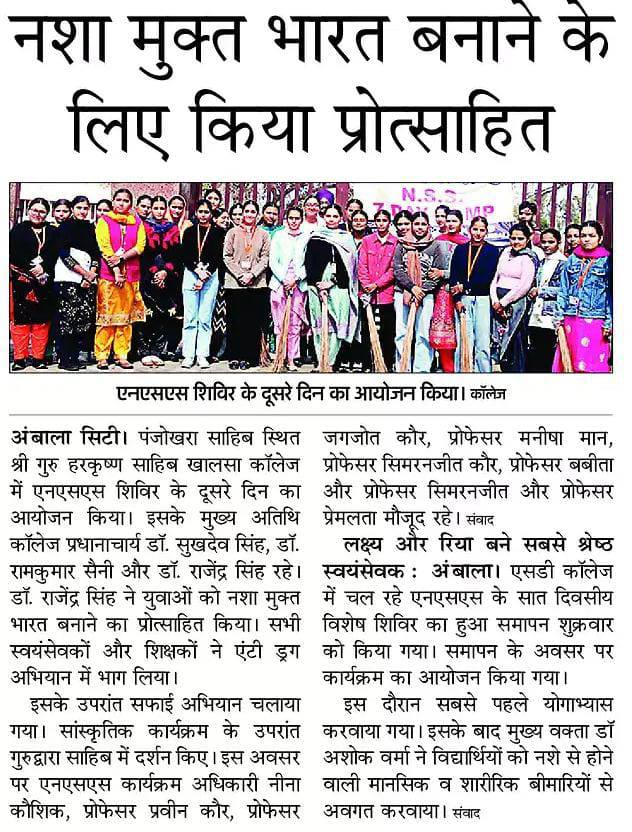 Sri Guru Harkrishan sahib Khalsa College Panjokhra sahib Ambala, successfully completed the 2nd day of NSS seven day camp, where the chief guest of the day Dr Rajinder Singh Soni delivered a lecture on anti drug abuse, Volunteers take pledge to control it and take part in ” Sawachta abhiyan ” in afternoon.